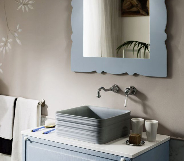 Arredo bagno finitura frassino pastello Marine, con piano top in marmo Orient, lavabo Trace in ceramica azzurra, specchiera Antibes. Miscelatore escluso. Un arredo colorato con tonalità pastello, un richiamo al passato estremamente elegante. Contattaci per scoprire la gamma colori e le misure disponibili.