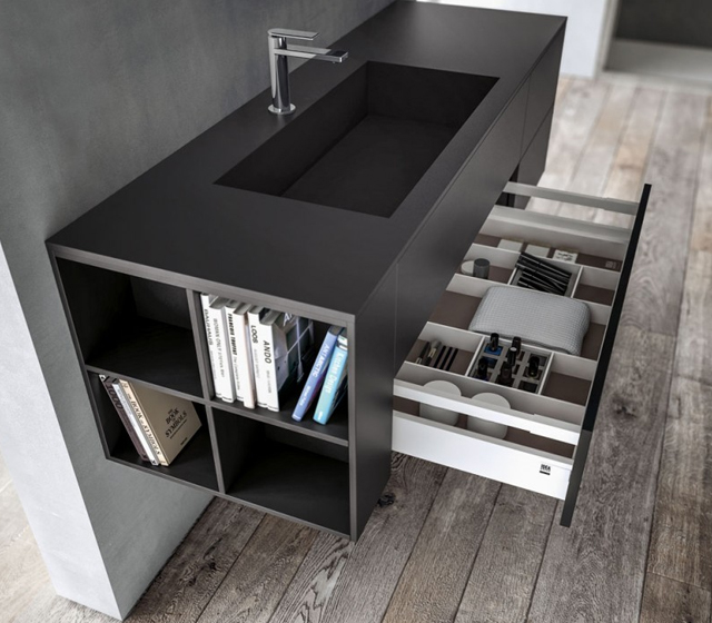 Installabile sia a terra che sospeso, questo arredo bagno si adatta a qualsiasi necessità di progettazione. Una composizione geometrica, preziosamente elegante, ma con spunti living di alta funzionalità, come il vano a giorno laterale.