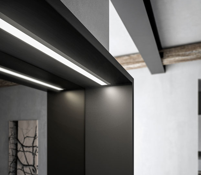 Un arredo bagno con cassettoni estraibili e vano a giorno laterale: un piano unico con lavabo integrato – realizzato in Fenix nero – e specchio incorniciato Sense con illuminazione a led incorporata.