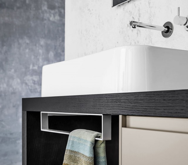 Questa tipologia di arredo bagno si integra perfettamente agli ambienti più disparati, come loft di prestigio, architetture contemporanee o ristrutturazioni contemporanee. Aggiunge un tocco in più la maniglia integrata all’anta, che arricchisce la struttura senza appesantirla.