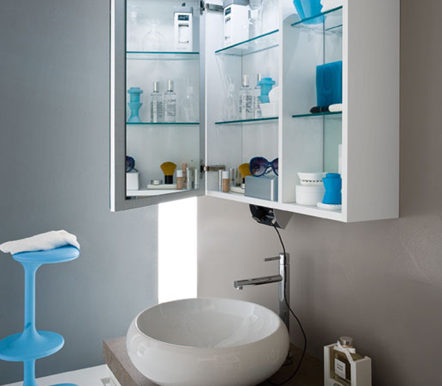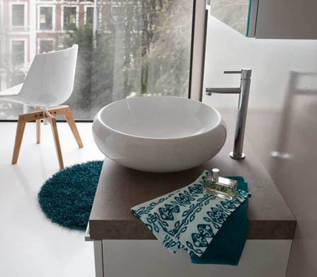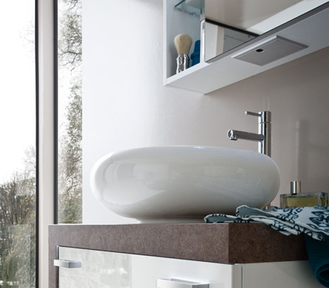 Luce e materia. La base è definita da una forma spessa 6 cm in finitura Porfido, che disegna il fianco e il piano per il lavabo in appoggio.