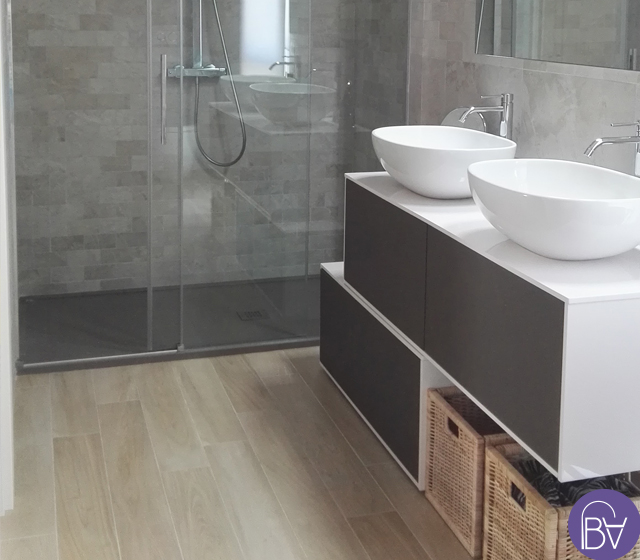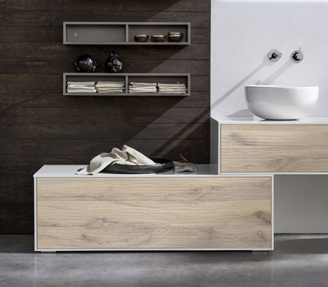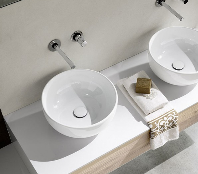 Il ripiano in mineralguss lucido, sottile e moderno, semplice e resistente, è combinato a due lavabi a ciotola Shui Alto in ceramica bianca, per dare un effetto complessivo di morbidezza e sinuosità.