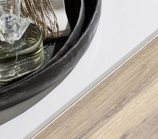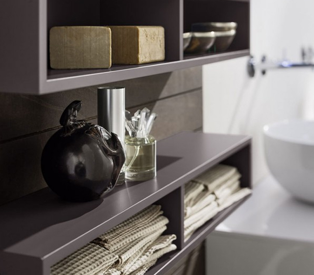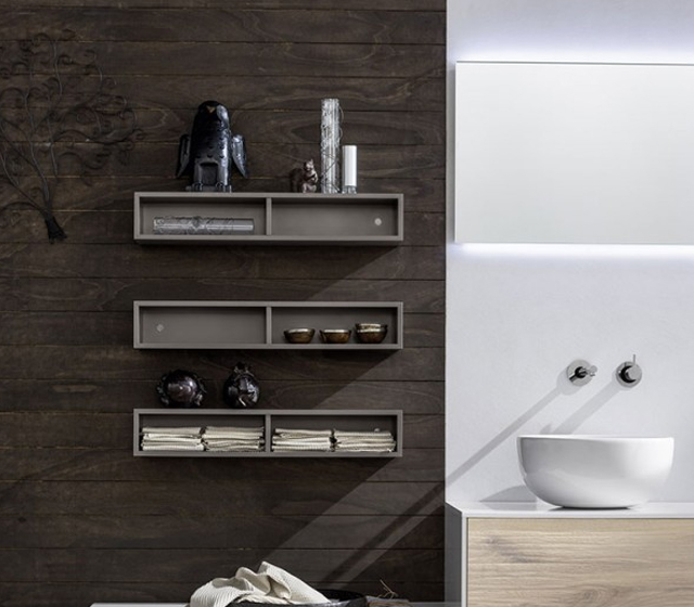 Completa l’arredo la specchiera de Lux, che gioca su un contrasto materico grazie ai profili in alluminio e il doppio sistema di illuminazione a led. Staccano completamente dalla cromaticità chiara le mensole in laccatura folding – tonalità terranova opaco – che donano un tocco un po’ più scuro ma sempre elegante.