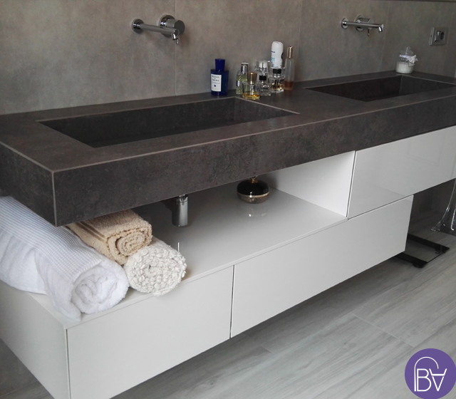 Arredo bagno sospeso con doppio lavabo mod. FOKOS PIOMBO 3 L 207,5 P 50,5 cm con cassetti sflalsati bianchi laccati lucidi, Piano Folding con doppio lavabo intergato in Laminam Fokos piombo e specchio orizzontale con doppio faretto a led.Ideale per chi è alla ricerca di un mobile contenitivo senza rinunciare al design