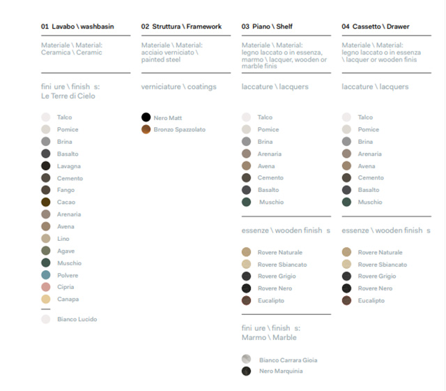 – piano: in marmo disponibile nelle finiture Bianco Carrara o Nero Marquinia; in legno disponibile in essenze Rovere Naturale, Sbiancato, Grigio, Moka e Nero; con cassetto contenitivo nelle finiture laccate Talco, Pomice, Brina, Arenaria, Avena, Cemento, Basalto, Muschio oppure in legno essenze Rovere;