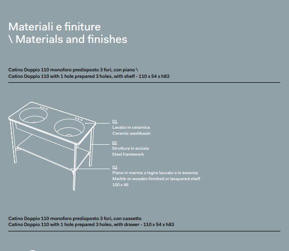 Lavabo Catino Doppio 110 con doppio lavabo in ceramica bianca lucida, struttura in acciaio nero opaco e piano in legno laccato nella finitura Terre di Cielo (specificare al momento dell’ordine la finitura Terre di Cielo desiderata). Miscelatore da piano, specchio, sifone design e piletta clic clack esclusi e disponibili con supplemento. La composizione comprende: il lavabo in ceramica bianca lucida, la struttura in acciaio nero opaco e il piano in legno laccato nelle finiture Terre di Cielo.