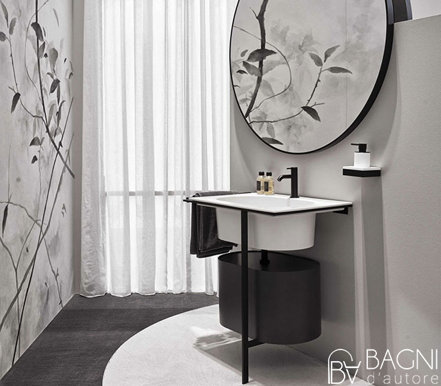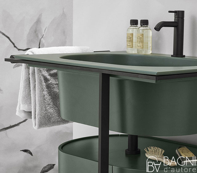 You can choose: cabinet Rovere or Eucalipto – Bronzo or Cemento framework – wooden towel rail