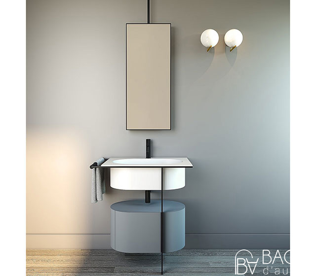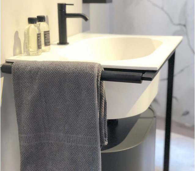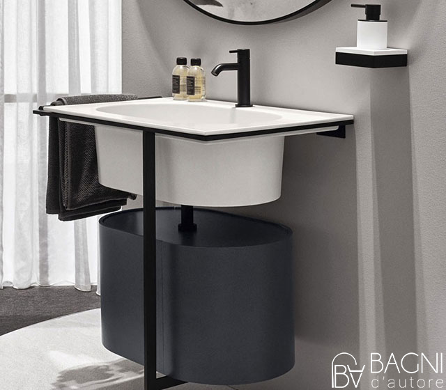 The composition includes: white washbasin – cabinet in finish Terre di Cielo (choose the Terre di Cielo’s finish) – black matt framework with towel rail