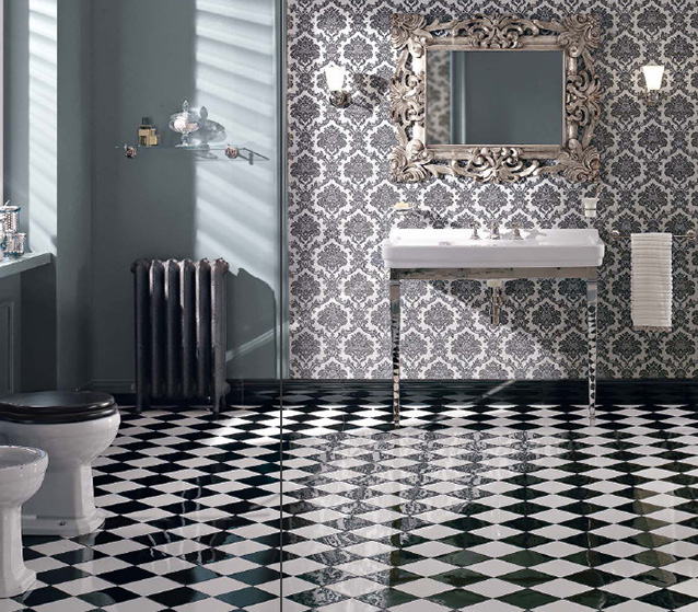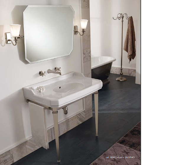Arredo bagno retrò con lavabo bianco con alzatina e struttura metallica cromo per lavabo linea Neoclassica. Colori lavabo disponibili con supplemento: nero. Finiture struttura disponibili con supplemento: ottone lucido, bronzo, nichel, nichel nero. Misure: 58×45