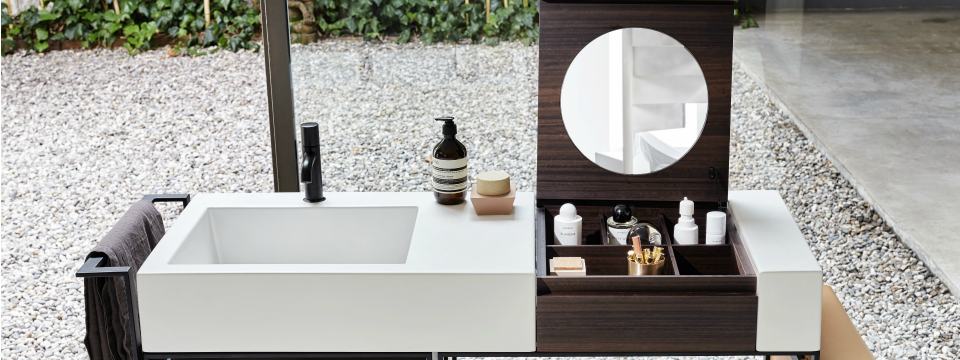 Il lavabo Narciso Vanity, il vero gioiello di queste novità, viene addirittura integrato con un elemento Make Up incredibilmente originale, dotato di specchio e di un meraviglioso vano portaoggetti e porta trucchi a cui può essere affiancato perfino una sacca in cuoio naturale.