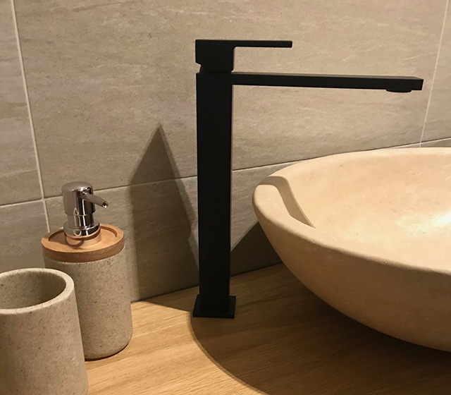 Miscelatore di design per lavabo alto, modello Tetris, colore nero. Un prodotto semplice ed elegante che ricrea uno stile contemporaneo e sempre attuale. Versione bocca dritta. Completo di flessibili di collegamento con attacco da 3/8″. Piletta esclusa.