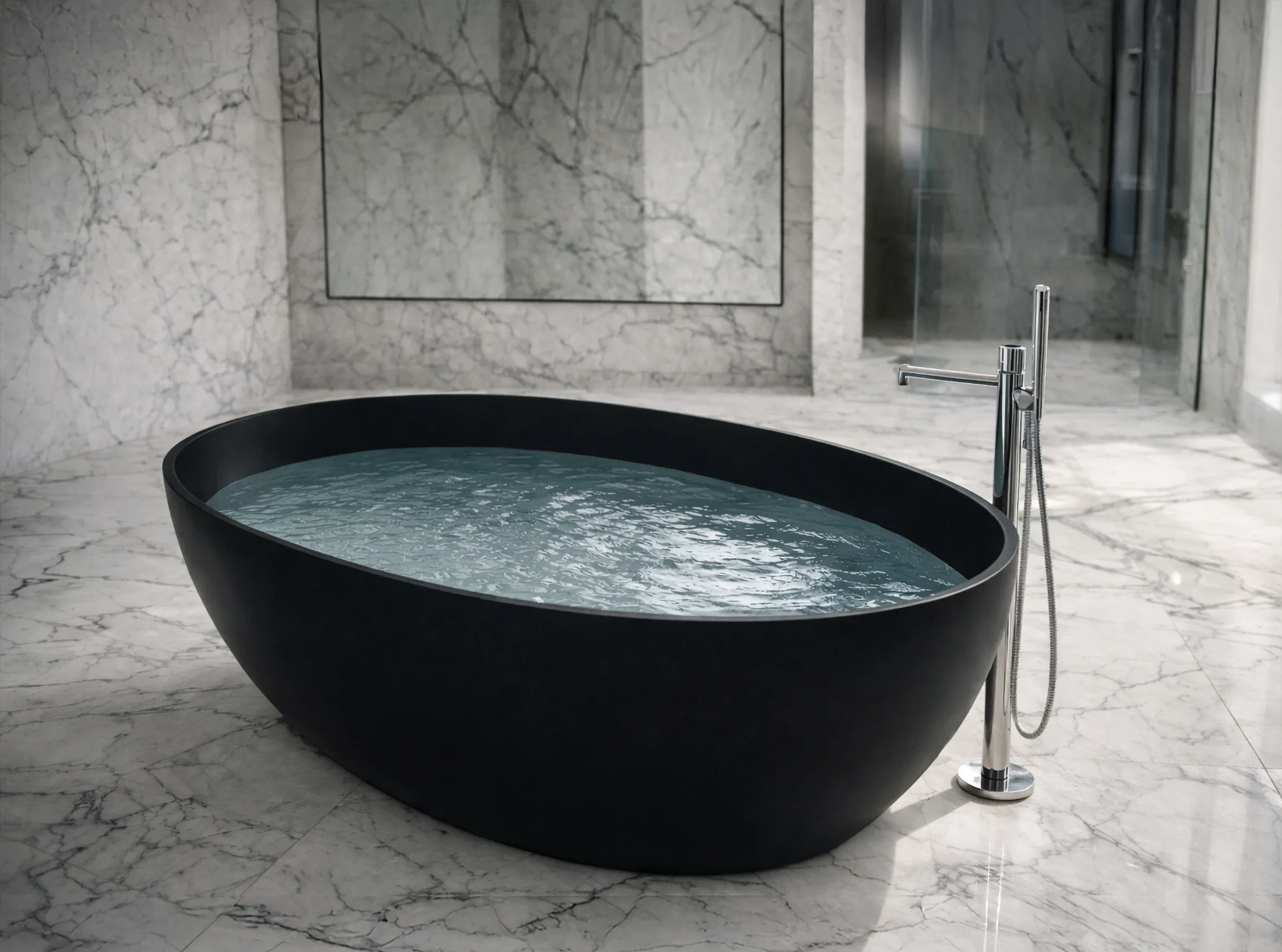 Realizzata in doppio strato di metacrilato con finitura matt nero opaco, la vasca garantisce elevata resistenza, piacevolezza al tatto e una superficie facile da pulire e mantenere nel tempo. Il materiale contribuisce inoltre a mantenere più a lungo la temperatura dell’acqua, migliorando il comfort durante l’utilizzo.