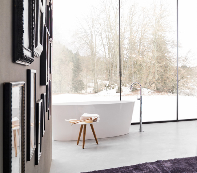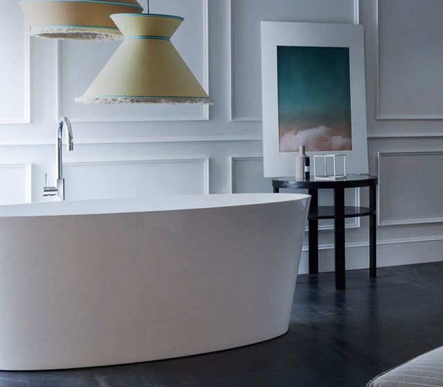 Vasca design centro stanza realizzata in Mineralguss bianco lucido, un materiale gradevole ed elegante al tatto