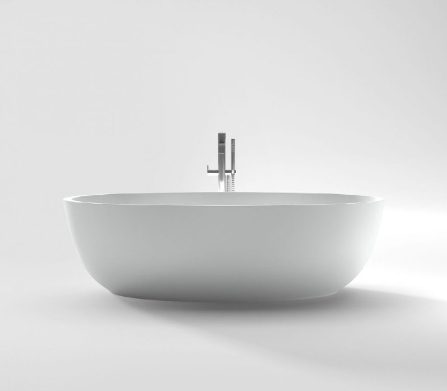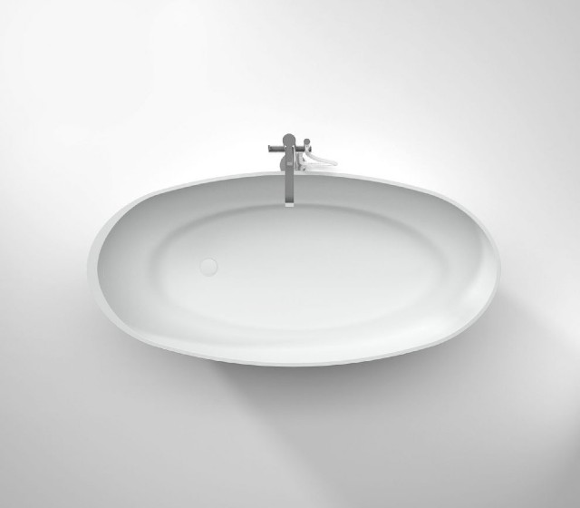 Vasca freestanding modello Round 169x80x50cm peso 75Kg in MINERALMARMO finitura bianco lucido. Con troppo pieno, piletta Up&Down e sifone. Copripiletta in tinta.