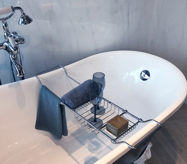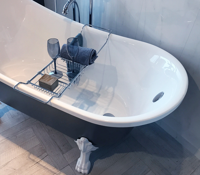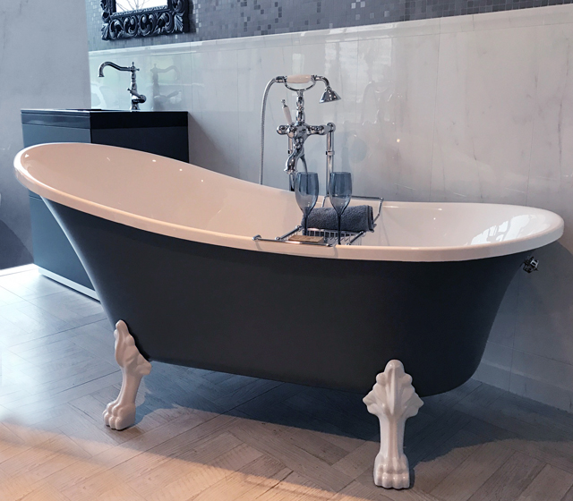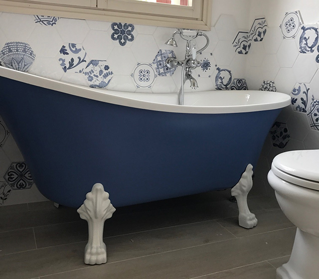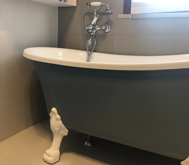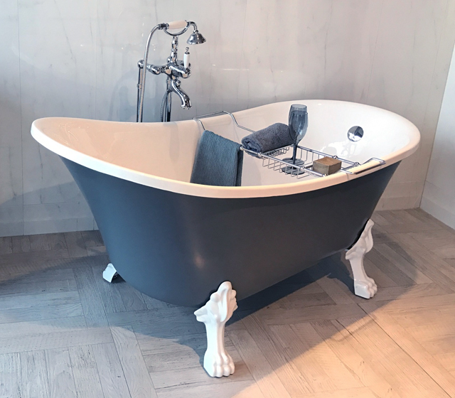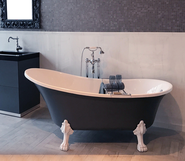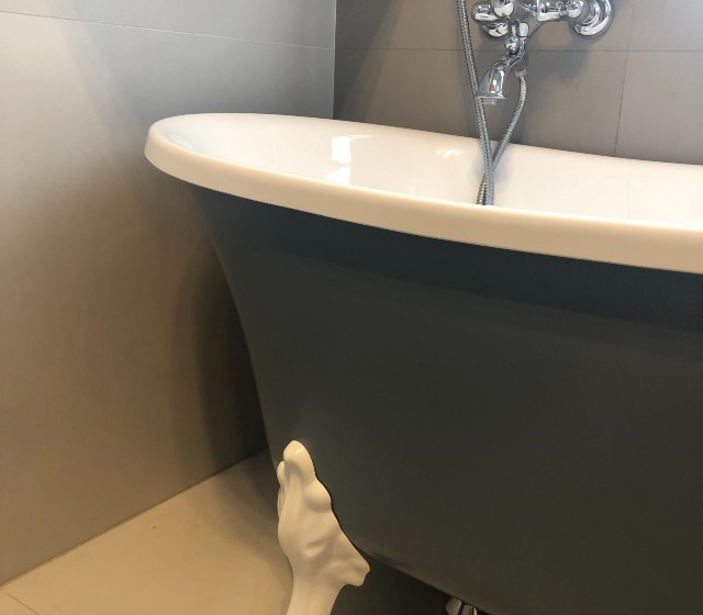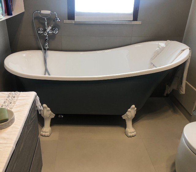 I piedini a zampa di leone, bianchi, enfatizzano ancora di più il colore esterno della struttura, richiamando la purezza del bianco interno.